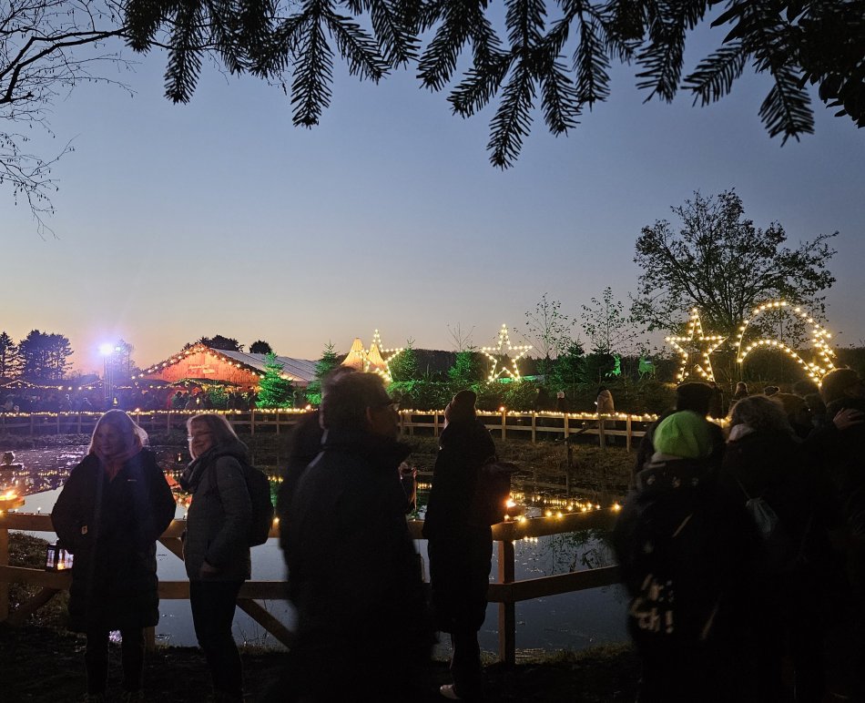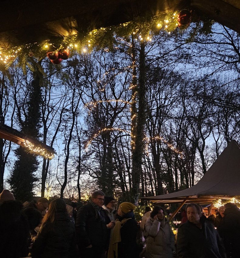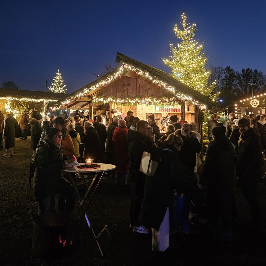 Hinter dem Markttor aus hohen Eichenstämmen eröffnet sich der stimmungsvolle Weihnachtsmarkt vor der urigen Waldhofkulisse. Viele Sitzmöglichkeiten und selbstgebackene Kuchen machen diesen Markt zum besonderen Geheimtipp! Liebevoll dekorierte Stände mit besonders freundlicher Bedienung, ausgefallenem Kunsthandwerk, Geschenkideen und weihnachtlichen Accessoires, duftende Pfannkuchen, regionale Spezialitäten, Glühwein und Vieles mehr. Den Abschluss bilden die farbenprächtigen Wasserfontänen.