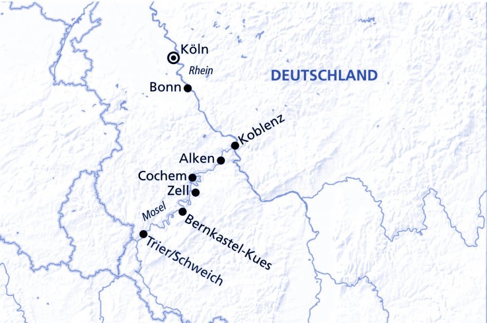 Kommen Sie an Bord der beliebten Swiss Crystal und lernen Sie in nur sechs Tagen die Schönheiten von Mosel und Rhein kennen. Ihre Reise beginnt in der Domstadt Köln. Am Deutschen Eck nimmt Ihr Schiff Kurs auf die Mosel. Romantische Städte wie Cochem und Bernkastel-Kues laden zum Verweilen ein. In Trier steht Kultur auf dem Programm. Historische Baudenkmäler, wie z.B. die Porta Nigra, bilden einen der Höhepunkte Ihrer Reise. Von Alken aus bieten wir die Möglichkeit, auf einem Ausflug die Burg Eltz zu besichtigen. Nach Aufenthalten in Koblenz und Bonn geht Ihre erlebnisreiche Reise in Köln zu Ende.