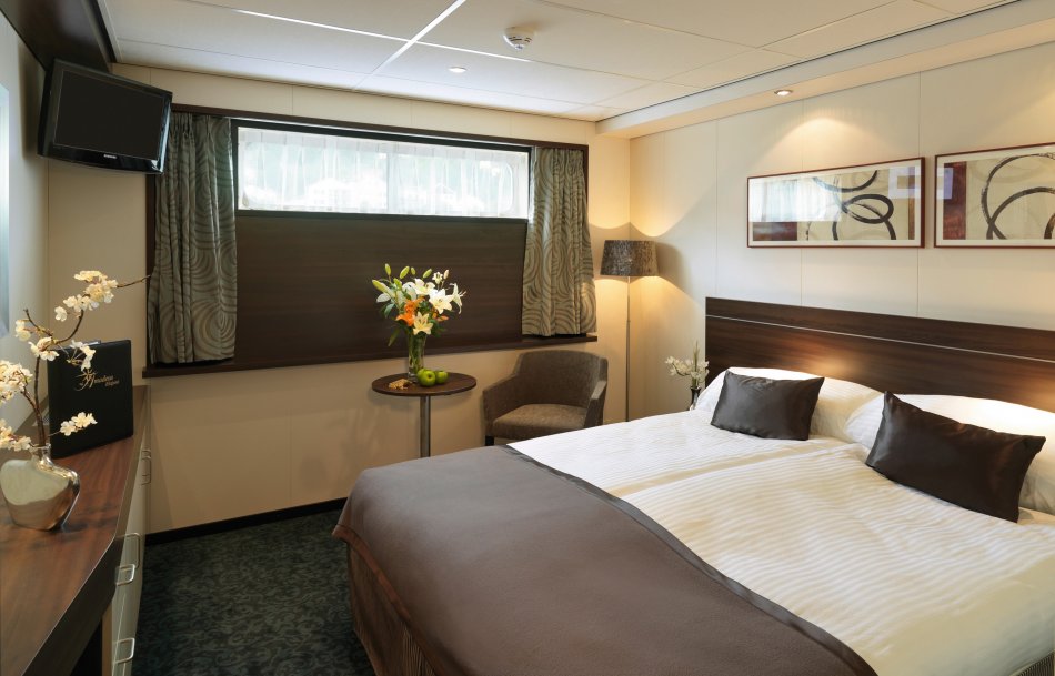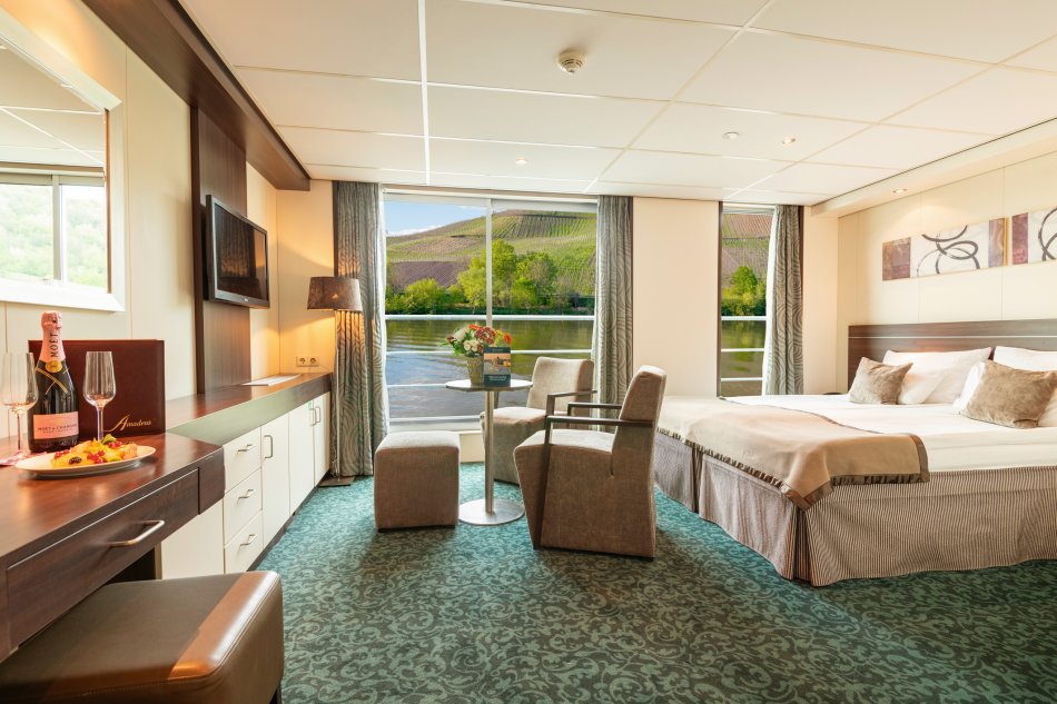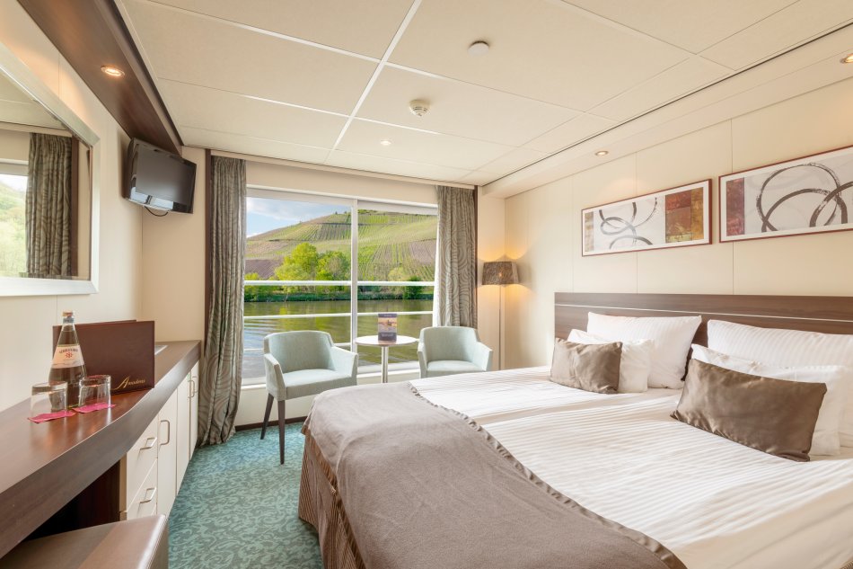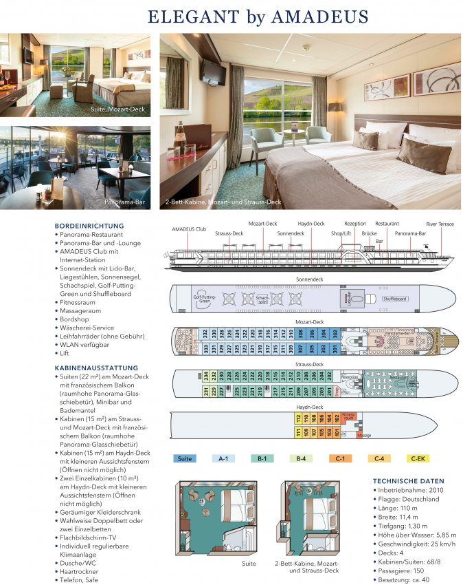 KABINEN: MS ELEGANT by Amadeus verfügt über 68 Kabinen mit ca. 15 qm (Einzelkabinen mit ca. 10 qm), die sich auf dem Haydn-Deck sowie auf dem Strauß- und Mozart-Deck befinden. Die Kabinen auf dem Haydndeck verfügen über ein Aussichtsfenster (Öffnen nicht möglich), während sich die Kabinen auf dem Mittel- und Oberdeck durch einen franz. Balkon auszeichnen. Zur Ausstattung aller Kabinen zählt ein Doppelbett, das auch in zwei Einzelbetten geteilt werden kann, Dusche/WC, Haartrockner, TV, Safe, geräumiger Kleiderschrank, Bordtelefon, Sitzmöglichkeiten und eine individuell einstellbare Klimaanlage. Alle Kabinen sind außen gelegen und mit hochwertigen Hotelbetten bestückt. Wenn Sie während Ihrer Reise noch exklusiver wohnen möchten, dann entscheiden Sie sich für eine der 8 herrlichen, ca. 22qm großen Amadeus-Suiten. Genießen Sie Ihre Zeit im privaten Ambiente und stoßen z. B. am französischen Balkon mit einem Glas Sekt aus der Minibar an, während das Schiff langsam dahin schippert.