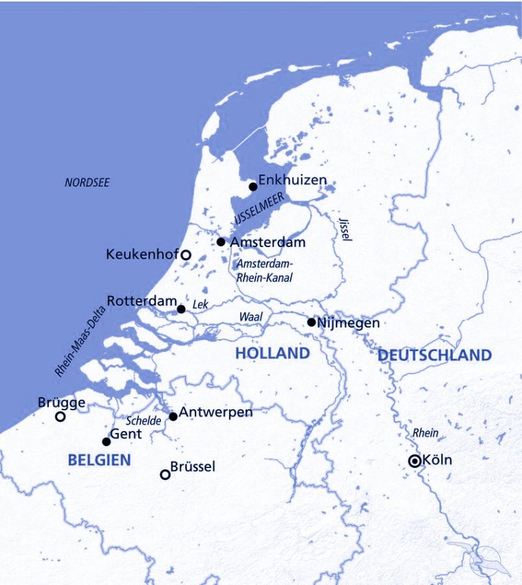 Kanäle, Flüsse und Meeresarme durchziehen Holland und Belgien und führen Sie zu malerischen Städtchen und pulsierenden Hafenstädten wie Amsterdam, Rotterdam und Antwerpen. Im malerischen Hansestädtchen Hoorn erleben Sie auf einem Rundgang die typische Atmosphäre in der Zuidersee-Stadt aus dem "goldenen Jahrhundert". Die lange Liegezeit in Amsterdam bietet die beste Möglichkeit, die Amstel-Metropole und das Umland kennenzulernen. Besuchen Sie das schöne Brüssel auf einem Ausflug in Antwerpen und erleben Sie den imposanten Grande Place. Romantisch und bezaubernd, eine Stadt wie im Bilderbuch, ist Brügge. Über Schelde und die Waal nimmt Ihr Schiff Kurs auf den Rhein, und nach einer erholsamen Nacht an Bord geht Ihre Reise in Köln zu Ende.