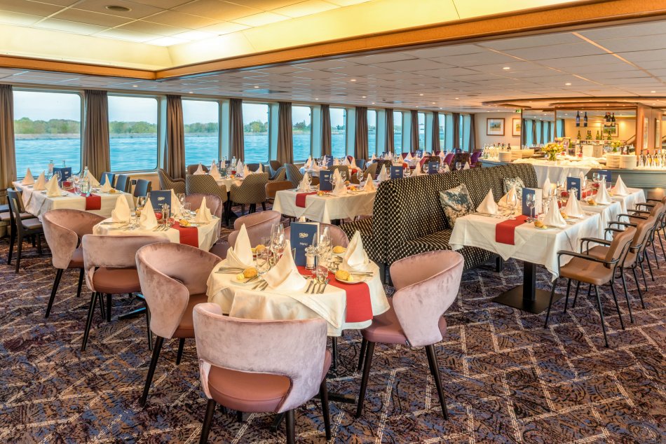 Im großzügigen Panorama-Restaurant finden alle Gäste zu einer Tischzeit Platz. Lassen Sie sich vom freundlichen Personal verwöhnen. Auf dem Speiseplan stehen internationale Spezialitäten ebenso wie typische französische Gerichte. Bei der Buchung des Getränkepakets (gg. Aufpreis) beachten Sie bitte, dass dies nur für die gesamte Dauer der Kreuzfahrt und für alle in der Kabine untergebrachten Personen erworben werden kann. Das Paket beinhaltet folgende Getränke von 09:00 Uhr bis 24:00 Uhr: off ene Hausweine und -sekt im Glas, Fass-/Flaschen bier, alkoholfreies Bier, Cocktails, Longdrinks, off ene alkohol freie Getränke, Kabinen- und Ausfl ugswasser, Kaffeespezialitäten ohne Alkohol, heiße Schokolade und Tee.