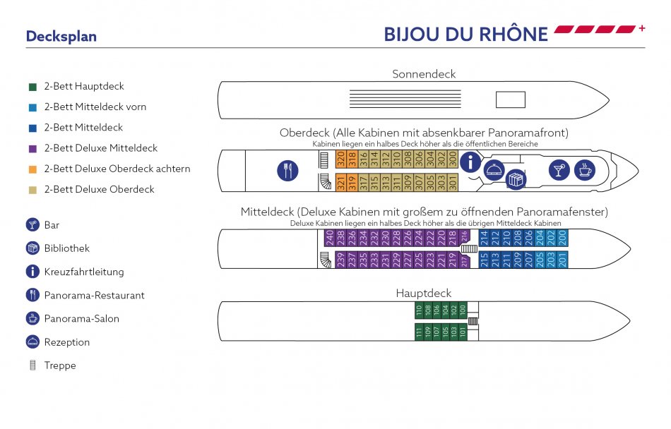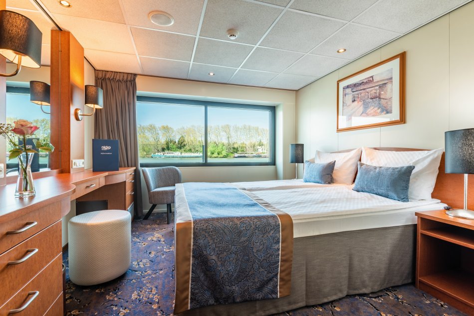 Alle Kabinen sind stilvoll und komfortabel eingerichtete Außenkabinen und verfügen über Dusche/WC, Haartrockner, Sat.-TV, Telefon, Safe und eine individuell regulierbare Klimaanlage. Die Kabinen auf dem Mittel- und Oberdeck sind ca. 14 m² groß. Die Deluxe Mitteldeck-Kabinen haben ein großes, zu öffnendes Panoramafenster, die Deluxe Oberdeck-Kabinen eine absenkbare Panoramafront. Alle anderen Kabinen auf dem Mitteldeck haben nicht zu öffnende, große Panoramafenster. Die nebeneinanderstehenden Betten können auf Wunsch auch getrennt gestellt werden. Die Hauptdeck-Kabinen sind ca. 11 m² groß, verfügen über nicht zu öff nende Aussichtsfenster und sind alle mit einem Klappbett und einem Sofabett ausgestattet.
