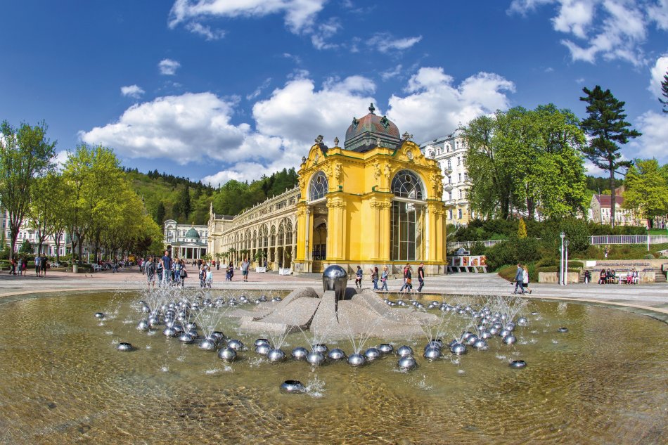 Singende Fontäne: Direkt vor der Hauptkolonnade Marienbads kann man das herrliche Wasserspiel der Singenden Fontäne im Takt zu klassischer Musik von Chopin, Mozart, Bach, Gounaod, Smetana oder Dvořák beobachten. Aus mehr als 250 Düsen tanzen die Wasserfontänen in einem fl achen, 18 Meter breiten Rundbecken um eine Blütenskulptur in der Mitte. Am Abend wird die Singende Fontäne von Lichteff ekten begleitet und zeigt ihren Betrachtern ein sinnliches Farbenspiel. Die Fontäne ist von Mai bis Oktober täglich in Betrieb.